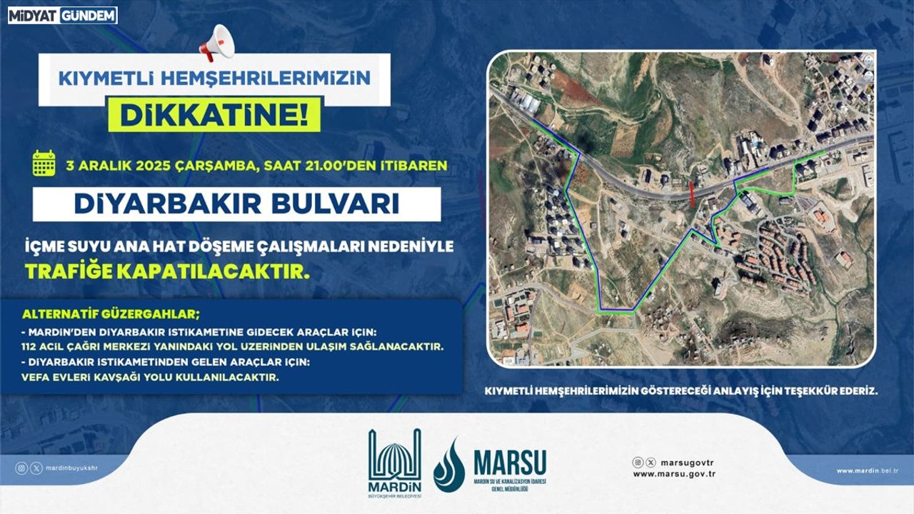 Son Dakika Mardin...Mardin Büyükşehir Belediyesi Su ve Kanalizasyon İdaresi (MARSU) tarafından yürütülen “Mardin İçme Suyu Projesi” kapsamında yapılacak yatay geçiş ana hat döşeme çalışmaları nedeniyle Diyarbakır Bulvarı’nın bir süreliğine trafiğe kapatılacağı bildirildi.