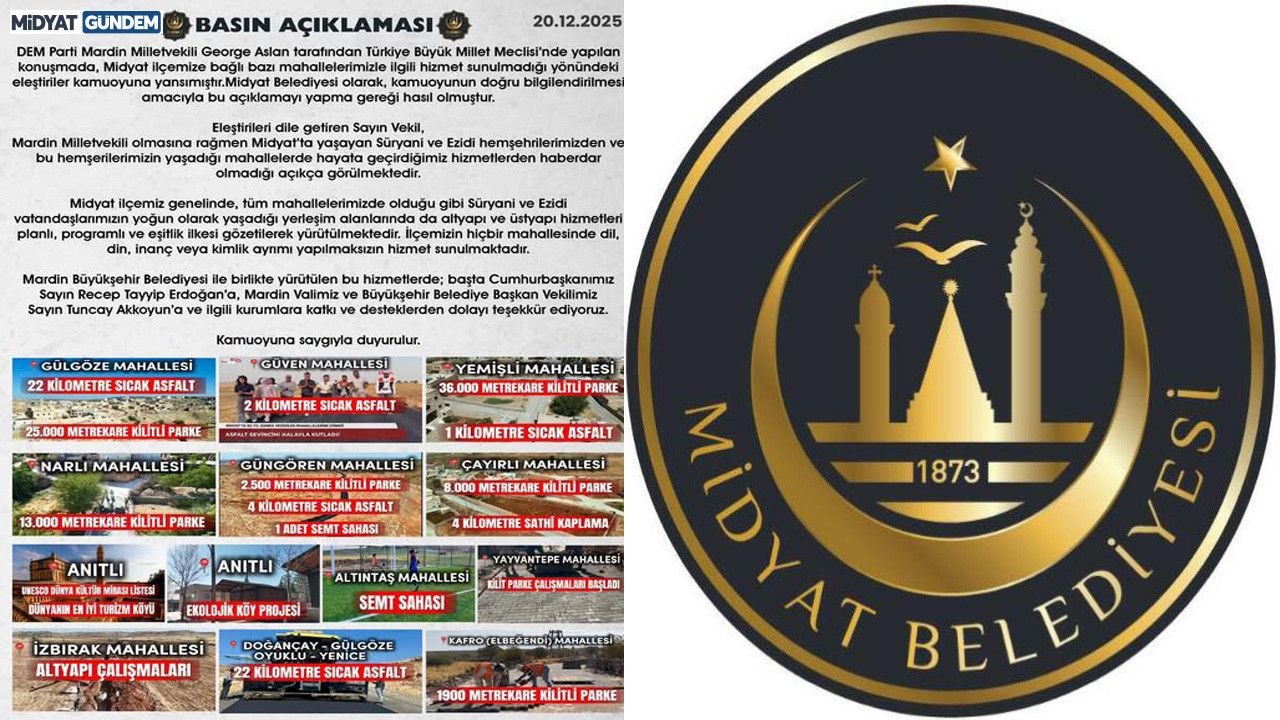 "Mardin Milletvekili Sayın George Aslan’ın, Midyat’ta yaşayan Süryani ve Ezidi hemşehrilerimizin bulunduğu mahallelerde hayata geçirdiğimiz hizmetlerden haberdar olmadığı açıkça görülmektedir. Midyat ilçemiz genelindeki tüm mahallelerimizde olduğu gibi, Süryani ve Ezidi vatandaşlarımızın yoğun olarak yaşadığı yerleşim alanlarında da altyapı ve üstyapı hizmetleri; planlı, programlı ve eşitlik ilkesi gözetilerek yürütülmektedir."