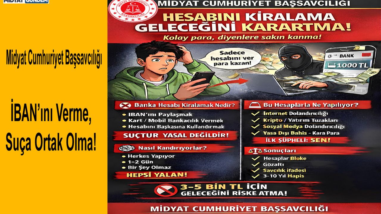 MARDİN/ MİDYAT – Midyat Cumhuriyet Başsavcılığı Bilişim Suçları Soruşturma Bürosu, son dönemde artış gösteren "banka hesabı kiralama" dolandırıcılığına karşı vatandaşları sert bir dille uyardı. "Hesabını Kiralama, Geleceğini Karartma!" sloganıyla başlatılan kampanya, dijital dolandırıcılık şebekelerinin ağına düşen masum vatandaşların nasıl birer suç ortağına dönüştüğünü gözler önüne seriyor.