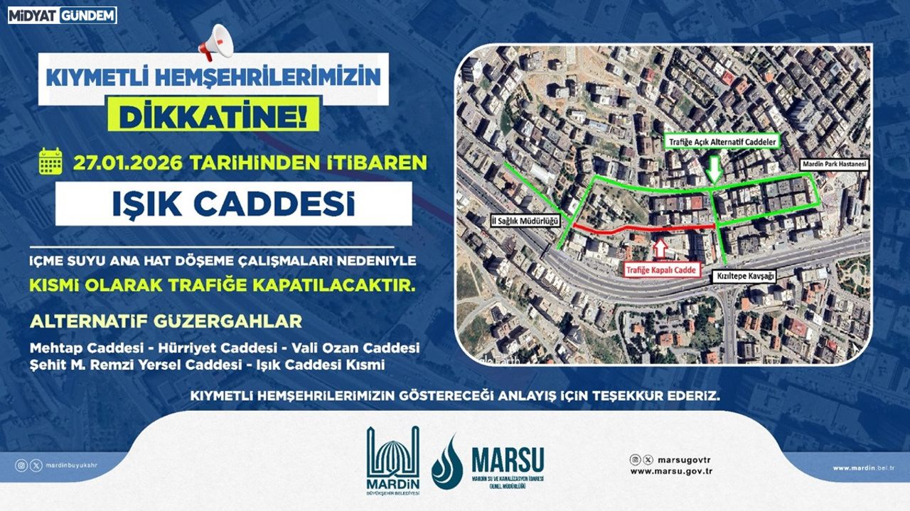 MARDİN : Mardin Büyükşehir Belediyesi Su ve Kanalizasyon İdaresi (MARSU) tarafından yürütülen “Mardin İçme Suyu Projesi” kapsamında Artuklu İlçesinde Işık Caddesi, trafik ve yaya güvenliğini sağlamak amacıyla kısmi olarak trafiğe kapatılacağı duyuruldu.
