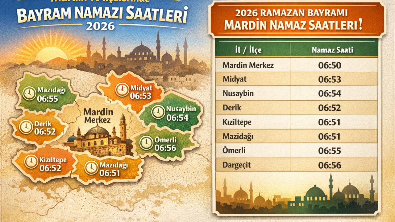 MARDİN - 2026 Ramazan Bayramı öncesinde Diyanet İşleri Başkanlığı, Mardin ve ilçeleri için bayram namazı saatlerini duyurdu. Bayram sabahı sabah namazını kılmak isteyen vatandaşlar, Mardin’de ve ilçelerinde belirlenen saatler doğrultusunda camilere giderek ibadetlerini eda edebilecek.