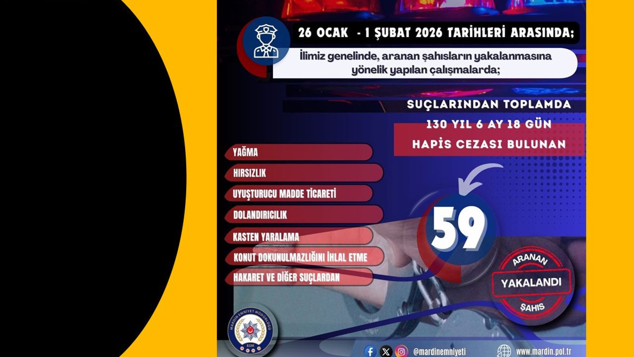 MARDİN - Bu kapsamda 26 Ocak – 1 Şubat 2026 tarihleri arasında gerçekleştirilen operasyonlarda, çeşitli suçlardan aranan toplam 59 şahıs yakalandı.