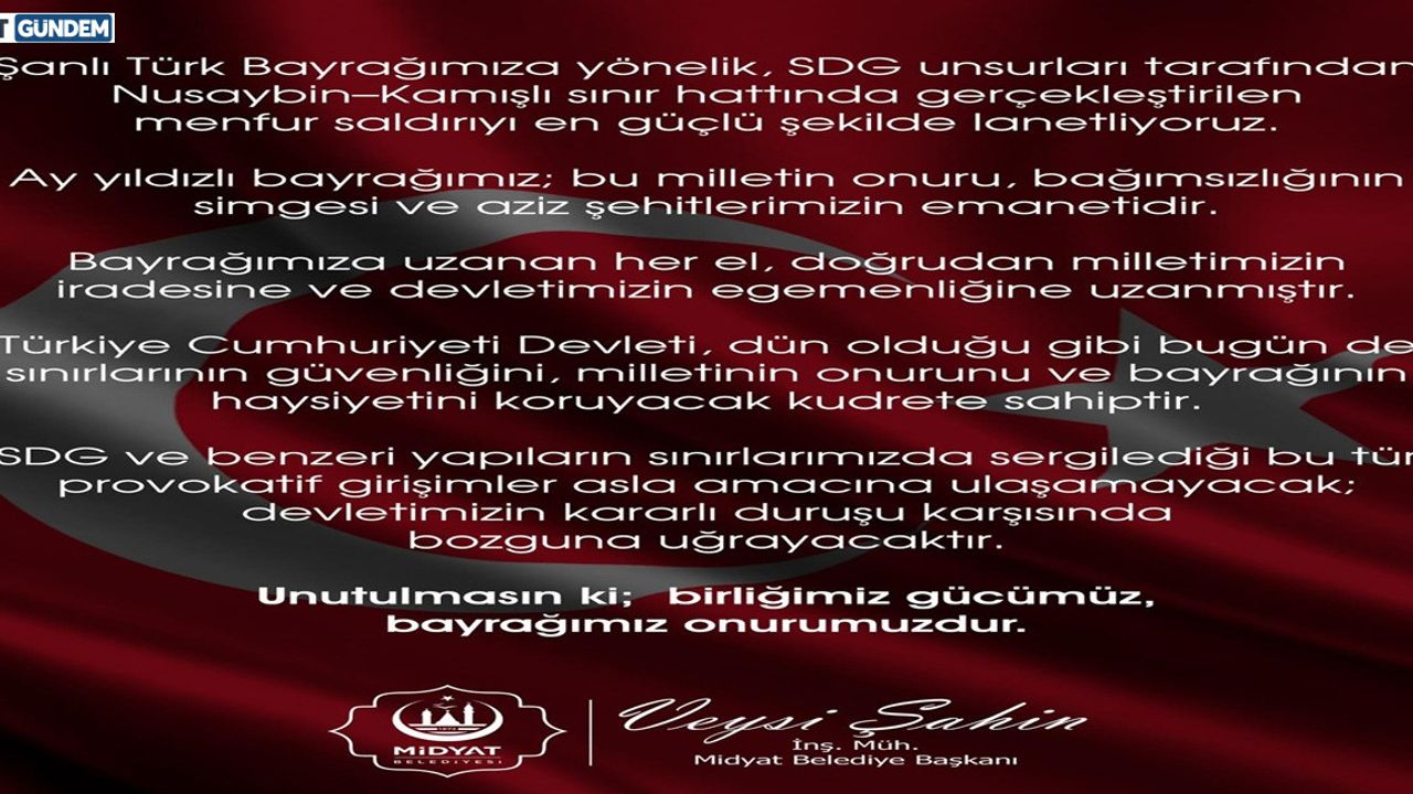MARDİN / MİDYAT - Mardin Midyat Belediye Başkanı Veysi Şahin, sosyal medya hesapları üzerinden yaptığı açıklamada, Nusaybin–Kamışlı sınır hattında SDG unsurları tarafından şanlı Türk bayrağına yönelik gerçekleştirilen saldırıyı sert bir dille kınadı.