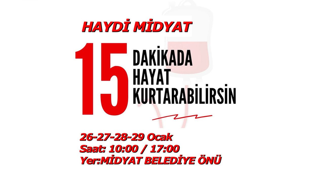 Türk Kızılay Mardin Şubesi, Midyat’ta kan bağışı kampanyası düzenliyor. “HAYDİ MİDYAT – 15 Dakikada Hayat Kurtarabilirsin” sloganıyla gerçekleştirilecek kampanya, 26-27-28-29 Ocak tarihlerinde vatandaşların katılımına açık olacak.