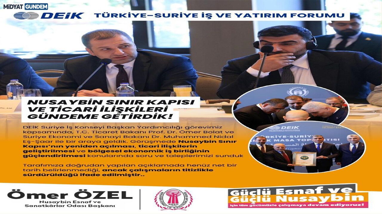 DEİK Suriye İş Konseyi Başkan Yardımcısı ve Nusaybin Esnaf ve Sanatkarlar Odası Başkanı Ömer Özel, forum kapsamında T.C. Ticaret Bakanı Prof. Dr. Ömer Bolat ve Suriye Ekonomi ve Sanayi Bakanı Dr. Muhammed Nidal el-Şaar ile özel bir görüşme gerçekleştirdi. Nusaybin Sınır Kapısı’nın ticari geçişlere açılması için yoğun temaslarda bulunan Özel, yerel esnafın ve bölge iş insanlarının beklentilerini doğrudan bakanlara sundu. Görüşmede, sınır kapısının açılmasının sadece yerel ekonomiyi değil, bölgesel ticareti de şahlandıracağı vurgulandı.