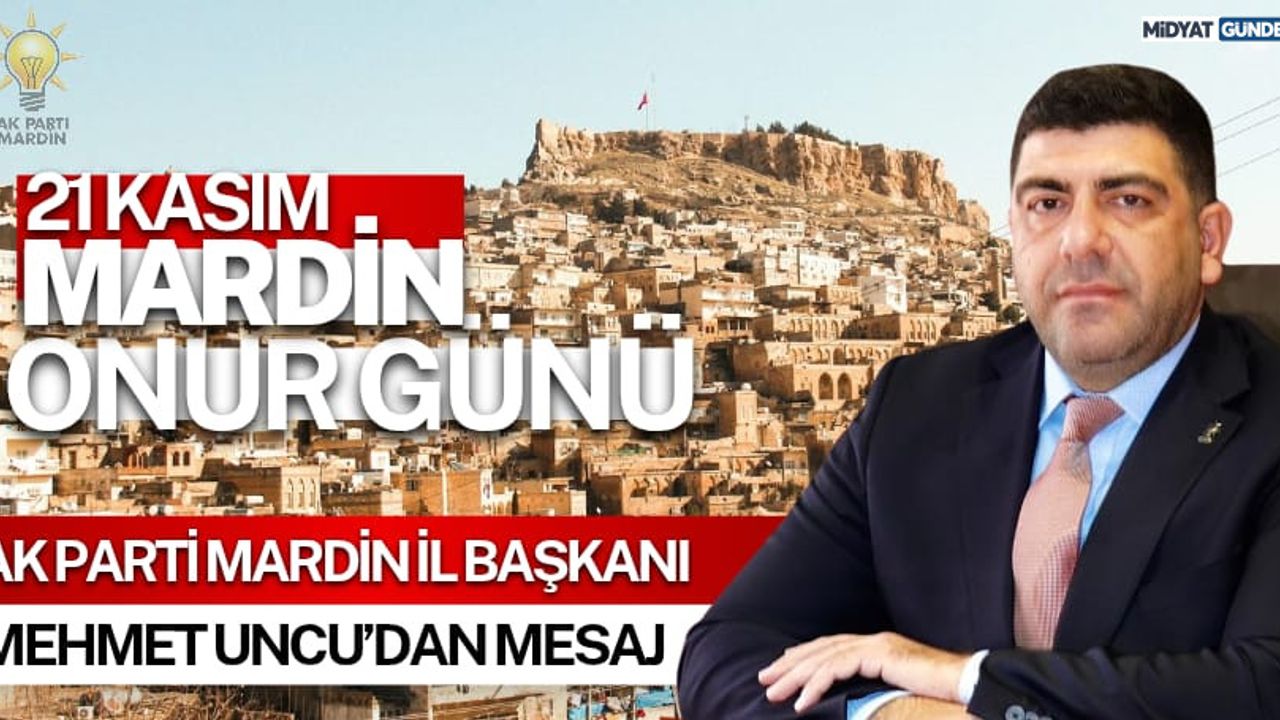 MARDİN : AK Parti Mardin İl Başkanı Mehmet Uncu, 21 Kasım Mardin Onur Günü dolayısıyla bir kutlama mesajı yayımladı. Mardin’in, medeniyetlerin kadim buluşma noktası olarak kardeşlik ve hoşgörünün güçlü bir sembolü olduğunu belirten Uncu, bu özel günü büyük bir gururla karşıladıklarını ifade etti.